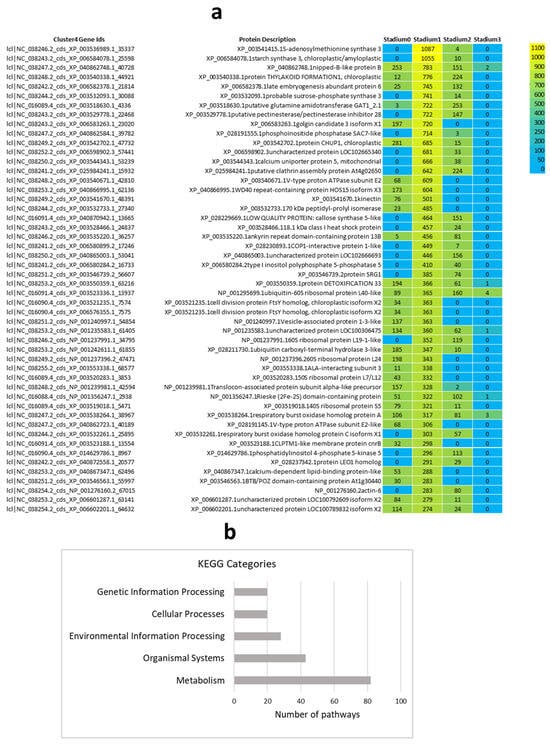 The results of the characteristically expressed genes in Cluster 4 are presented in Figure 4, highlighting a pronounced peak in expression at Stadium 1. GO enrichment analysis was performed on the 600 genes in Cluster 4, covering the three major GO categories: biological process (BP), molecular function (MF), and cellular component (CC). Additionally, KEGG pathway categorization was conducted to identify functionally enriched metabolic and signaling pathways. The top 30 significantly enriched GO terms across BP, MF, and CC, as well as key KEGG pathways, are visualized in Figure S1. A corresponding heatmap illustrates the expression patterns of these DEGs (Figure 4a). Using this, 600 gene KEGG pathway analysis was performed and the most significant KEGG categories are presented in Figure 4b.