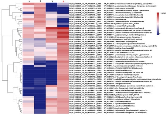 The top 50 DEGs from the pairwise comparison between Stadium 2 and Stadium 0 were plotted in a heatmap (Figure 5). Several of these genes are directly involved in hormone biosynthesis, signaling, and response pathways, indicating that substantial hormonal reprogramming occurs at stadium 2. AUX-induced protein 22D (XP_028206101.1) shows a clear downregulation pattern induced by IAA, marking an AUX-sensitive cluster. Carotenoid Cleavage Dioxygenase 4 (CCD4, XP_003516508.1) downregulation and 9-cis-epoxycarotenoid dioxygenase 2 (NCED2, NP_001241251.2) upregulation are involved in ABA biosynthesis, clustering with stress-induced patterns. The upregulation of Ethylene-Insensitive 3-like (EIN3-like, XP_005515001.1) transcription factor in stadium-2 is a prominent marker for ET response in the heatmap. 13S-lipoxygenase 2-1 (LOX, XP_035556401.1) upregulation may trigger the initial steps of the JA pathway.