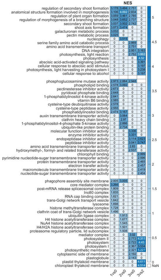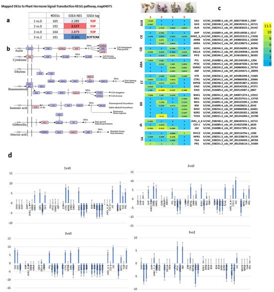 We performed GSEA to evaluate predefined gene sets exhibiting statistically significant expression differences between the investigated floral developmental stages. Gene ranking was determined using the maximum enrichment score to identify gene sets that were either upregulated or downregulated. This approach enabled us to gain insights into the biological processes most strongly linked to specific flowering phenotypes. Subsequently, we focused specifically on phytohormone-associated GO terms identified within the enriched gene sets across the investigated sample pairs (Figure 7). Upon summarizing the results, we found that SA- and ET-associated GO terms were consistently enriched across all floral developmental stadium comparisons (1 vs. 0, 2 vs. 0, and 3 vs. 0), suggesting their broad involvement throughout flower development. In contrast, a single AUX-associated GO term was uniquely identified in the 3 vs. 0 comparison, indicating a more stadium-specific role for auxin signaling at the overblown flower stadium.