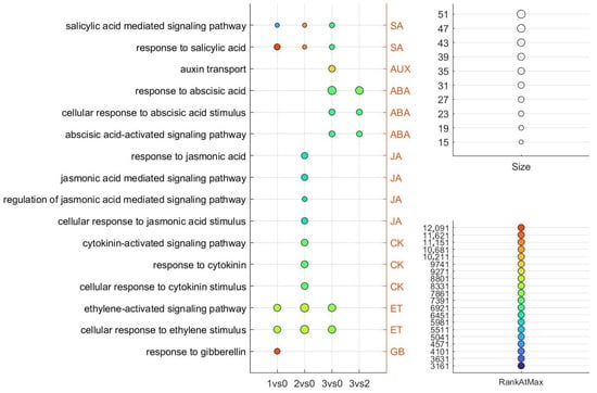 The phytohormone-related GO terms identified in the GSEA analysis of the investigated sample pairs are shown. The size of each term represents the number of DEGs, while RankAtMax indicates the point in the ranked gene list where the gene set reaches its maximum enrichment. Higher RankAtMax values suggest stronger collective gene expression within the set. Adjusted p-values (FDR) for GO term enrichment are represented in Table S1. All GO terms shown in the figure have FDR-adjusted p-values < 0.05, indicating statistically significant enrichment.