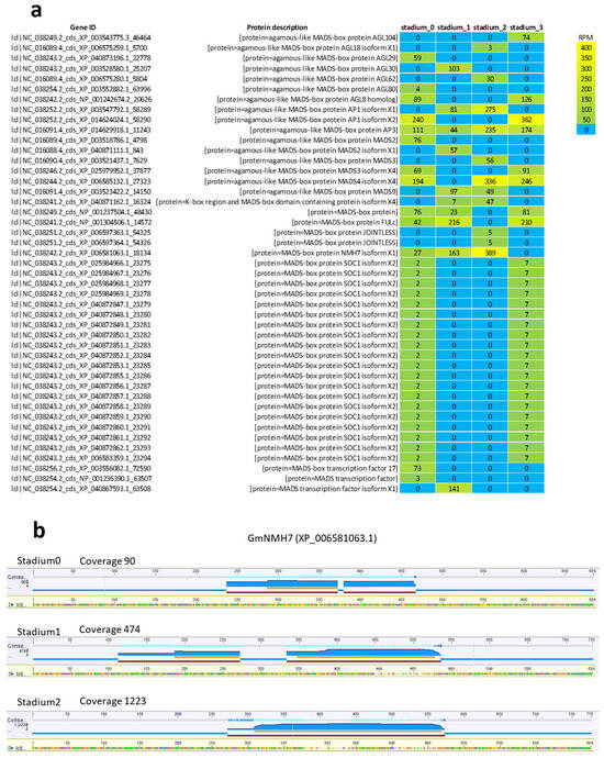 Heatmap of MADS-box DEGs expressed in the investigated floral tissues (a). Gene expression patterns were analyzed based on digital gene expression values, measured in Reads Per Million (RPM). Panel (b) visualizes read abundance mapped to the GmNMH7 gene, with the highest coverage observed in Stadium 2. Read abundance—reflecting gene expression levels—showed a progressive increase across floral development stadiums, indicating upregulation.