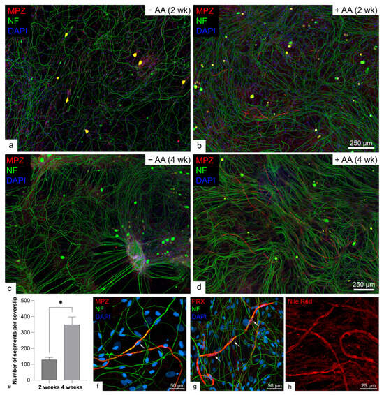 Robust myelination in rat Schwann cell (SC) and rat dorsal root ganglion (DRG) cell co-cultures supplemented with ascorbic acid (AA). A neurofilament (NF) antibody was used to label neurites and DAPI was used to counterstain cell nuclei. No myelin staining is observed in 2- or 4-week co-cultures without ascorbic acid (a,c), whereas myelination is evident in co-cultures with ascorbic acid (b,d). Quantification showed a significantly higher number of myelin segments in 4-week compared to 2-week co-cultures grown on 12 mm coverslips in 24-well plates ((e), *, p < 0.05, n = 3, t-test). In 2-week rat SC and rat DRG co-cultures treated with ascorbic acid, representative staining from separate samples (f–h) shows that myelin protein zero (MPZ) staining (f) highlighted myelin segments of SCs (arrow), while periaxin (PRX) staining (g) labeled both myelin segments and myelinating SC bodies (arrows). Nile red, a lipophilic dye, confirms the lipid-rich nature of the myelin sheath (h).