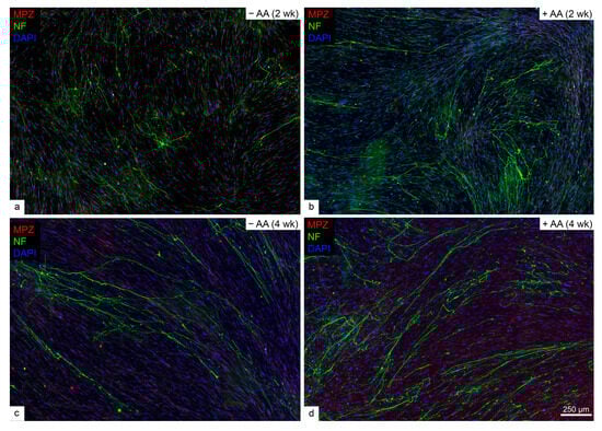 Human Schwann cells do not myelinate human iPSC-derived motor neurons. No myelin staining is observed in either 2- (a,b) or 4-week co-cultures (c,d), regardless of ascorbic acid (AA) supplementation (n = 3 per condition).