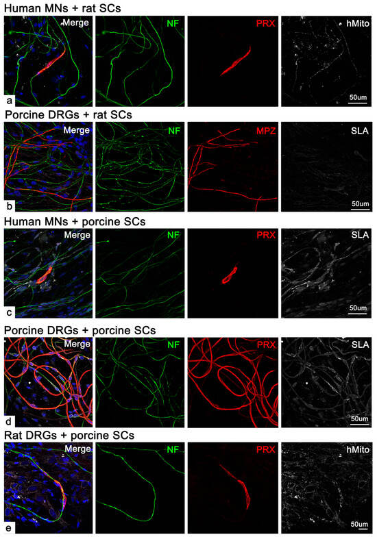 To determine whether human motor neurons (MNs) differentiated from induced pluripotent stem cells (iPSCs) were receptive to myelination, we performed cross-species co-cultures using human MNs, rat DRGs, or porcine DRGs co-cultured with either human SCs, rat SCs, or porcine SCs (Figure 3). We primarily used PRX to label myelinating SCs due to its positive reactivity in these three species (Figure 3a,c–e), since the MPZ antibody we used was only positive for rat and human cells; however, it was useful for porcine DRGs with rat SC co-cultures (Figure 3b) to rule out any potential porcine SC myelination by residual porcine glial cells. To further distinguish Schwann cells or neurons from different species, we used human mitochondrial markers to identify human and porcine cells, whereas porcine cells were specifically recognized with swine leukocyte antigen (SLA) when co-cultured with human cells (Figure 3). The results showed that both rat and porcine SCs were capable of forming myelin when co-cultured with all three species including human MNs, albeit with much lower occurrence when rat SCs were co-cultured with human MNs or when porcine SCs were co-cultured with rat DRGs. Human SCs failed to form myelin under all conditions (Figure 2 and Figure S2 and Table 1).