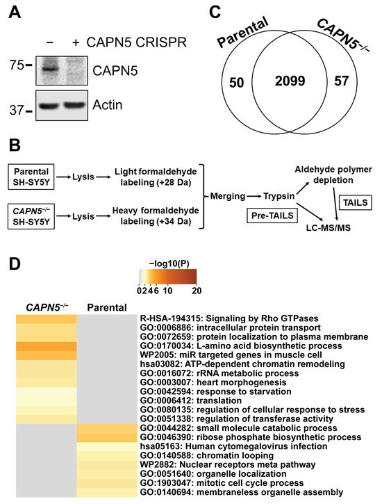 The effect of the inactivation of CAPN5 on the proteome of SH-SY5Y cells. (A) Immunoblotting showing the inactivation of CAPN5 with CRISPR technology. The bars indicate molecular weight marker bands (kDa). (B) Schematic of our proteomics workflow. (C) Most proteins detected by the pre-TAILS shotgun proteomics were identified with peptides that were at similar levels in the parental and the CAPN5−/− SH-SY5Y cells. A small number of proteins were identified only by peptides at significantly higher levels in the parental or the CAPN5−/− cells. (D) Pathway analysis of the differentially expressed proteins by Metascape.