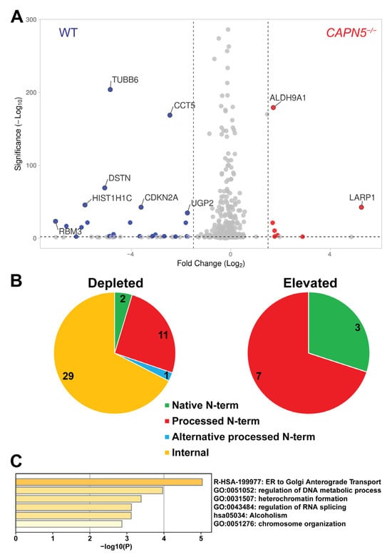 The identification of CAPN5 substrate candidates with TAILS. (A) The peptides identified by TAILS are visualized by the volcano plot. Significant outlier cutoff values were determined after log(2) transformation by boxplot-and-whiskers analysis. Significance is defined as −log10(p), shown here with a cutoff > 2. The grey dots represent peptides that were either at similar levels in the parental and CAPN5-deficient SH-SY5Y lysates or were detected with a significance under the cutoff. (B) N-terminal peptides that were detected by TAILS at significantly lower or higher levels in the CAPN5−/− SH-SY5Y cells, as compared to the parental SH-SY5Y cells. One of the 30 depleted internal peptides could represent an alternative processed N-terminus. (C) Pathway and annotation term analysis of the 29 putative CAPN5 substrates in Table 1 by Metascape.