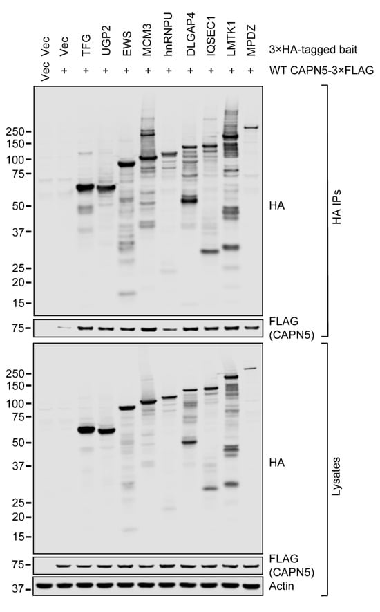 The expression of CAPN5-3×FLAG (“prey”) and the 3×HA-tagged proteins (“bait”) were controlled by their respective empty vectors. The baseline affinity of CAPN5-3×FLAG to the anti-HA immunoaffinity resin was controlled by the 3×HA vector control. Immunoblotting of the lysates showed that the expression of all nine 3×HA-tagged proteins was detectable at the expected molecular weights (Figure 3). HA-immunoreactive bands were also present at lower molecular weights in the lysates of the cells that were transfected with the 3×HA-tagged constructs, likely representing proteolytic products of the respective proteins.