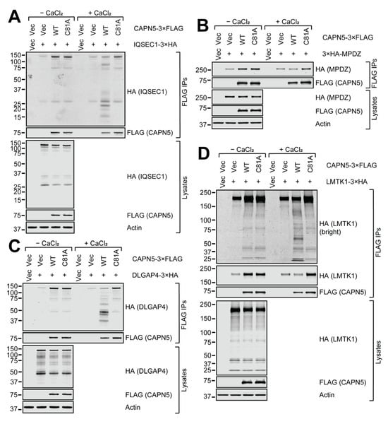 The 3×HA-tagged IQSEC1, DLGAP4, MPDZ and LMTK1 proteins were all clearly enriched by the WT and C81A CAPN5-3×FLAG baits compared to the 3×FLAG vector control (Figure 4). Upon calcium addition, the bands that correspond to the full-length co-precipitated 3×HA-tagged proteins got weaker in the presence of WT CAPN5. For IQSEC1, DLGAP4 and LMTK1, lower molecular weight (MW) proteolytic fragments were also apparent. The 3×HA-MPDZ protein was the only example among the nine proteins tested where no proteolytic fragmentation was detected with WT CAPN5-3×FLAG. It suggests that CAPN5 may have had at least one proteolytic cut site close to the N-terminus of MPDZ that resulted in fragments that were too short to be detected. It is also possible that CAPN5 could have had several proteolytic cut sites within MPDZ, diluting the signal enough to make the fragments undetectable.