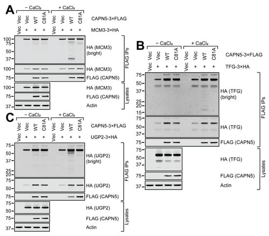 The TFG-3×HA and the UGP2-3×HA proteins were significantly enriched by the CAPN5-3×FLAG baits, whereas the enrichment of MCM3-3×HA was more modest (Figure 5). Although the loss of the full-length 3×HA-tagged bands upon calcium addition was less prominent, low MW proteolytic fragments of all three proteins were detectable.
