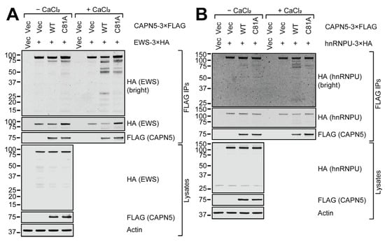 The 3×HA-tagged EWS protein showed significant affinity to the anti-FLAG resin (Figure 6A). The enrichment of the EWS-3×HA protein was only apparent with the C81A mutant CAPN5-3×FLAG bait. Upon calcium addition, both the loss of full-length EWS-3×HA and the appearance of smaller proteolytic fragments were clear with WT CAPN5-3×FLAG. Unexpectedly, proteolytic fragments around 50 kDa were also detected in the presence of C81A CAPN5-3×FLAG. These were likely due to a co-precipitating protease activity, since the C81A CAPN5 mutant is proteolytically dead [].