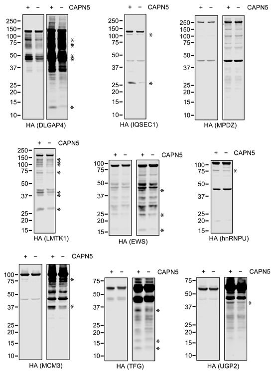 Immunoblotting of the lysates with anti-HA antibody showed that the fragmentation of some of the tested proteins was apparently stronger in the parental SH-SY5Y cells than in the CAPN5−/− cells (Figure 7). Some of the protein bands that were more intense in the parental SH-SY5Y cellular lysates were similar to proteolytic fragments that were detected in the in vitro CAPN5 assays. These included DLGAP4 (under 50 kDa), IQSEC1 (above 25 kDa), LMTK1 (between 100 and 150 kDa), hnRNPU (above 75 kDa), MCM3 (at 37 kDa and above 75 kDa), TFG (above 15 kDa) and EWS (at 25 kDa).