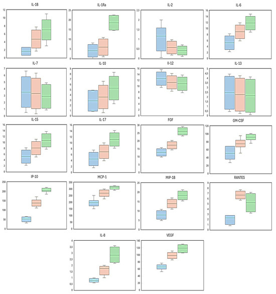 Levels of the pro-INF and pro-ANG mediators in the AH of the study participants displaying higher statistical significance among all study determinations. Boxplots color codes: blue corresponds to the SCG group; pink corresponds to the T2DM + NPDR group; and finally green corresponds to the T2DM-DR group. IL: interleukin; IL-1RA: the interleukin-1 receptor antagonist; bFGF: basic fibroblast growth factor; GM-CSF: granulocyte–macrophage stimulating factor; IP10: interferon gamma-induced protein 10 kDa; MCP-1: monocyte chemoattractant protein-1; MIP-1β: macrophage inflammatory protein-1 beta; RANTES: regulated on activation, normal T cell-expressed and -secreted; VEGF: vascular endothelial growth factor.