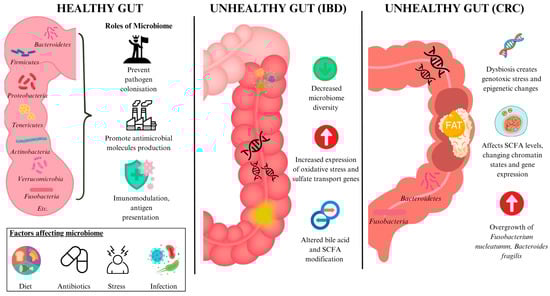 A comparison between a healthy gut and the diseased guts observed in IBD and CRC. Abbreviations: CRC: colorectal cancer; IBD: inflammatory bowel disease; SCFA: short chain fatty acid.
