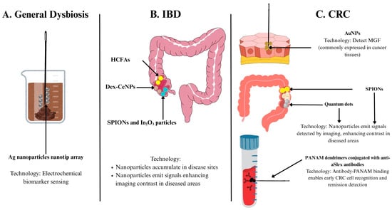 (A–C) Nanomedicine-enabled diagnostics for (A) general dysbiosis, (B) inflammatory bowel disease and (C) colorectal cancer. Abbreviations: Ag: silver; aSlex: anti-Slex; AuNP: gold nanoparticle; CRC: colorectal cancer; Dex-CeNP: dextran coated cerium oxide nanoparticle; HCFA: hypoxia-activatable and cytoplasmic protein-powered fluorescence cascade amplifier; IBD: inflammatory bowel disease; In2O3: indium (111) oxide; MGF: mechano-growth factor; PANAM: poly(amidoamine); SPION: superparamagnetic iron oxide nanoparticle.