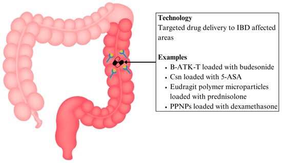 To overcome the problems of the current first line therapy 5-ASA, including a high pill burden (2–4x dosing daily) and systemic adverse effects [], a chitosan (Csn) bound ginger nanocarrier has been developed to enhance site-targeted drug delivery to inflamed mucosal linings in IBD. Csn is formed via the deacetylation of chitin, and it has been recognised for its non-toxicity, biocompatibility, and biodegradability. The drug carrier complex was able to entrap an estimated 50% of the drug. At pH 1.2, the amine groups of Csn chain are protonated, causing the Csn chain to relax due to mutual electrostatic repulsion. This results in the swelling of nanocarriers, allowing large amounts of water molecules to enter the nanoparticle network, causing drug dissolution. Such is the mechanism of pH-dependent drug release. Nanotechnology thereby addresses the limitations related to drug retention and patient compliance in conventional 5-ASA therapy [] (Figure 3 and Table 2).