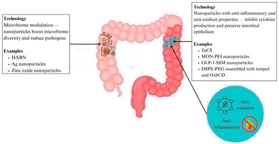 Nanomedicine is an up-and-coming technology and branch of evolving medicine that uses nanotechnology for disease prevention, monitoring, and intervention through new modalities for the imaging, diagnosis, treatment, repair, and regeneration of biological systems []. Nanoparticles have unique chemical and physical properties that make them suitable for optical imaging, allowing for highly sensitive diagnostic tools with reduced degrees of invasiveness []. The high surface area to volume ratio of nanoparticles, combined with their ability to have surface modifications, enable them to deliver therapeutic agents to target sites more accurately, reducing unwanted side effects and thereby improving treatment efficacy []. Nanomedicine has revealed a promising future, with third-generation nanovectors bearing multi-functionality. Externally, there are recognition units for nanoparticles to interact with target sites, while internally, they are drug-loaded to deliver their desired therapeutic effect at the right place and time []. With its rapid development, nanomedicine has revealed great potential in becoming an asset to the healthcare industry by being able to overcome the limitations of traditional treatment methods. The different types of nanomedicine available and their uses in treating gut dysbiosis and its associated diseases will be discussed below.