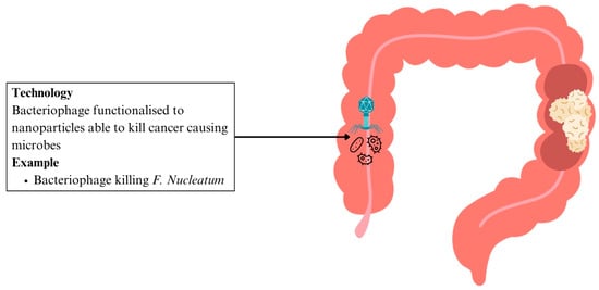 Nano-probiotics have demonstrated utility in their anti-cancer properties. Synthesised Ag/Lactobacillus rhamnosus GG nanoparticles (Ag-LNPs) were assessed against CRC cell lines and significantly decreased the viability of these cell lines from 7.8–1000 μg/mL, possibly due to the activation of ROS, which led to cell damage and death []. The probiotic bacteria Lactobacillus casei was also used to synthesise copper oxide nanoparticles (CuONPs) that exerted cytotoxic effects by suppressing growth, increasing oxidative stress, and inducing apoptosis on cancer cells, alongside antimicrobial effects on gram positive and negative bacteria [] (Table 2). Other nanotechnologies that have shown anti-cancer properties include selenium nanoparticles synthesised by Lactobacillus casei [,], dead nano-sized Lactobacillus plantarum (LP) [], and AuNPs synthesised by novel probiotic Lactobacillus kimchicus [] (Figure 5). These technologies highlight how nano-probiotics can go beyond conventional supplementation to have bioactive and anti-cancer effects in the gut.