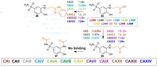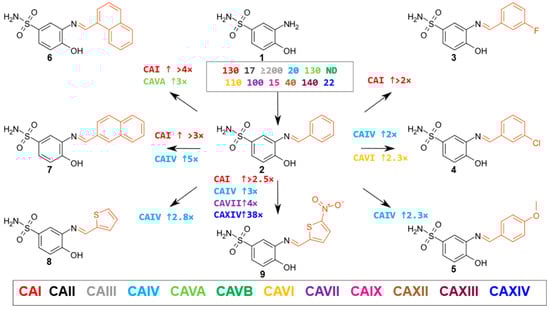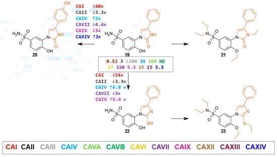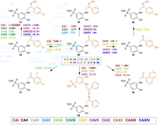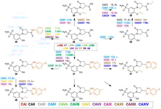 | Compound | CAI | CAII | CAIII | CAIV | CAVA | CAVB | CAVI | CAVII | CAIX | CAXII | CAXIII | CAXIV |