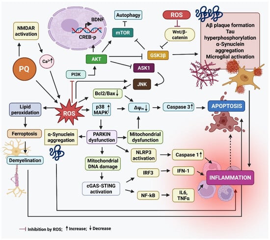 - Chen, L.; Na, R.; Boldt, E.; Ran, Q. NLRP3 inflammasome activation by mitochondrial reactive oxygen species plays a key role in long-term cognitive impairment induced by paraquat exposure. Neurobiol. Aging 2015, 36, 2533–2543. [Google Scholar] [CrossRef]
