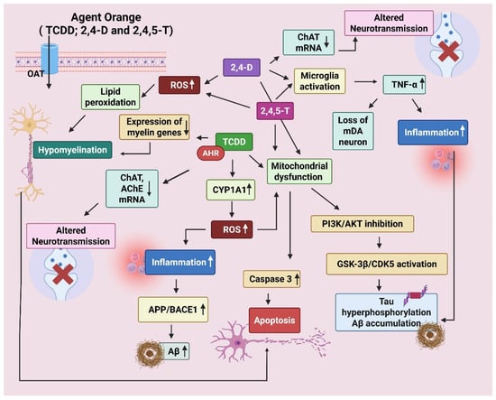 | Agent Orange/Components | AD | Human CNS-derived neuroepithelial cells | 250 μg/mL (2,4-D and 2,4,5-T) | Increased Aβ, tau phosphorylation, and lipid peroxidation; Increased ChAT; Decreased AChE | Oxidative damage, Cytotoxicity | [117] |