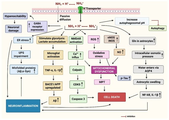 - Adlimoghaddam, A.; Sabbir, M.G.; Albensi, B.C. Ammonia as a Potential Neurotoxic Factor in Alzheimer’s Disease. Front. Mol. Neurosci. 2016, 9, 57. [Google Scholar] [CrossRef]