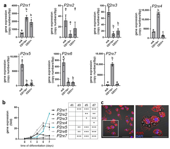 P2rx5 is highly expressed by mature brown adipocytes. (a) Cell type-specific gene expression of the purinergic P2X receptors (P2rx1, P2rx2, P2rx3, P2rx4, P2rx5, P2rx6, P2rx7) in mature brown adipocytes (mA), CD11b+ myeloid cells, and CD31+ endothelial cells isolated from murine brown adipose tissue (BAT) using magnetic-activated cell sorting (MACS) (n = 4); (b) gene expression of P2rx1, P2rx2, P2rx3, P2rx4, P2rx5, P2rx6, and P2rx7 during the differentiation of stromal-vascular cell (SVC)-derived brown adipocytes (n = 4); (c) P2X5 staining in primary brown adipocytes. Red, P2X5; blue, DAPI. Scale bar: 50 µm. Data are presented as mean values ± SEM. (a) A one-way ANOVA followed by Tukey’s multiple comparisons test comparing cell fractions with each other was performed. Different letters denote significant differences between cell fractions. (b) A one-way ANOVA followed by Dunnett’s multiple comparisons test comparing the different days of differentiation to day 0. In the table, significant differences are indicated by asterisks (* p < 0.05, ** p < 0.01, *** p < 0.001).