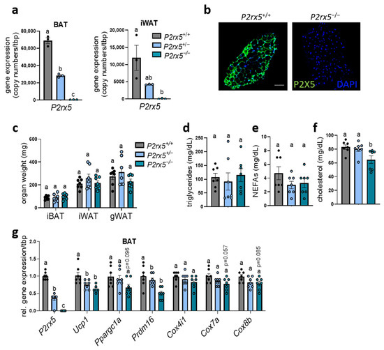 P2rx5 deficiency resulted in lower expression of thermogenic markers in BAT. (a–g) P2rx5 knockout mice (P2rx5−/−), heterozygous (P2rx5+/−), and controls (P2rx5+/+) were housed at 22 °C. (a) Gene expression of P2rx5 in BAT and inguinal white adipose tissue (iWAT) (n = 3). (b) Whole-mount staining of P2X5 in BAT of P2rx5−/− and P2rx5+/+ mice. Green, P2X5; blue, DAPI. Scale bar: 50 µm. (c) Adipose tissue weights, (d) plasma triglycerides, (e) plasma non-esterified fatty acids (NEFAs), and (f) plasma cholesterol levels of P2rx5 knockout mice (P2rx5−/−), heterozygous (P2rx5+/−), and controls (P2rx5+/+) (n = 7). (g) Gene expression of thermogenic marker genes in BAT of P2rx5−/−, P2rx5+/−, and P2rx5+/+ mice housed at 22 °C (n = 7). Data are presented as mean values ± SEM. A one-way ANOVA followed by Tukey’s multiple comparisons test comparing wild type, heterozygous, and homozygous P2rx5 knockout mice was performed. Different letters denote significant differences.
