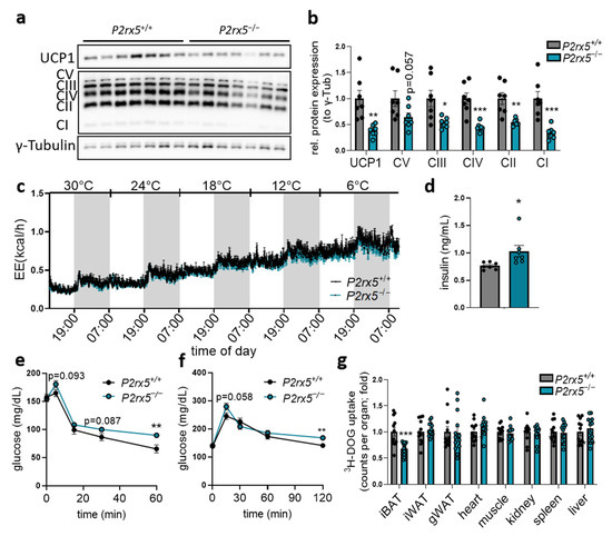 P2rx5 deficiency improves glucose disposal by BAT. (a–b,d–g) P2rx5 knockout mice (P2rx5−/−), and controls (P2rx5+/+) were housed at 22 °C. (a) Western blot analysis of UCP1, respiratory chain (OXPHOS) complexes, and g-Tubulin in BAT as well as (b) quantification of proteins shown in (a) (n = 7). (c) Energy expenditure in P2rx5+/+ and P2rx5−/− mice housed at indicated environmental temperatures (30 °C, 24 °C, 18 °C, 12 °C, and 6 °C with a stepwise decrease in temperature every 24 h) in metabolic chambers (n = 6). (d) Plasma insulin levels of P2rx5+/+ and P2rx5−/− mice (n = 7). (e) Blood glucose levels during insulin tolerance test (n = 12) and (f) blood glucose levels during oral glucose tolerance test (n = 12–13) of P2rx5+/+ and P2rx5−/− mice. (g) Uptake of 3H-deoxyglucose (DOG) into interscapular BAT (iBAT), inguinal WAT (iWAT), gonadal WAT (gWAT), heart, muscle, kidney, spleen, and liver (n = 12–13). Data are presented as mean values ± SEM. * p < 0.05, ** p < 0.01, and *** p < 0.001 by Student’s t test.