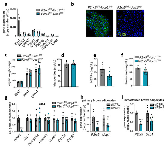 To assess the cell type specific role of P2rx5 expressed by brown adipocytes, we generated brown adipocyte-specific P2rx5-knockout mice (P2rx5fl/fl-Ucp1Cre+) as well as control littermates (P2rx5fl/fl-Ucp1Cre−). Successful deletion of P2rx5 was detected in BAT, again verifying P2rx5 to be predominantly expressed by the brown adipocytes but not other cell types in thermogenic adipose tissues (Figure 4a). Since Ucp1+ positive beige adipocytes are present in WAT depots upon thermogenic activation in mice housed below thermoneutrality, a lower expression of P2rx5 was also detected in iWAT and gonadal WAT (gWAT) of P2rx5fl/fl-Ucp1Cre+ compared to P2rx5fl/fl-Ucp1Cre− controls (Figure 4a). In various other organs, e.g., the heart, muscle, and the liver, P2rx5 expression levels were unaffected (Figure 4a). In line with the mRNA expression data, efficient depletion of P2X5 in BAT could be demonstrated by immunohistochemistry (Figure 4b). Under these conditions, P2rx5fl/fl-Ucp1Cre+ and P2rx5fl/fl-Ucp1Cre− mice display comparable adipose tissue weights as well as plasma triglyceride levels (Figure 4c,d). Plasma non-esterified fatty acid and cholesterol levels were decreased in P2rx5fl/fl-Ucp1Cre+ mice compared to controls (Figure 4e,f). Similarly to whole-body P2rx5-knockout mice, lack of P2rx5 in brown adipocytes resulted in lower Ucp1 expression (Figure 4g). To confirm this finding on a cellular level, we knocked-down P2rx5 in differentiated primary and immortalized murine brown adipocytes in vitro using an siRNA-mediated approach. In line with the results obtained in vivo, P2rx5 knockdown is associated with lower Ucp1 expression (Figure 4h,i).