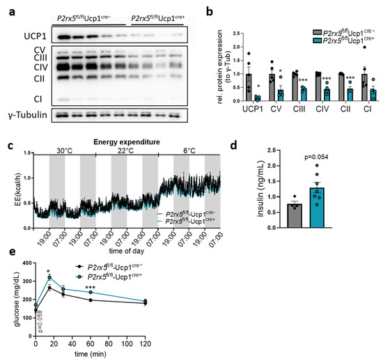 Brown adipocyte-specific P2rx5 deletion impaired glucose tolerance. (a,b,d,e) Brown adipocyte specific P2rx5-deficient mice (P2rx5fl/fl-Ucp1Cre+) and P2rx5fl/fl-Ucp1Cre− mice were housed at 22 °C. (a) Western blot analysis of BAT and (b) quantification of proteins shown in (a) (n = 4–5). (c) Energy expenditure in P2rx5fl/fl-Ucp1Cre+ and P2rx5fl/fl-Ucp1Cre− mice housed at indicated environmental temperatures in metabolic chambers. Here, ambient temperature was decreased every other day starting at thermoneutrality (30 °C) to mild cold exposure (22 °C) and cold exposure (6 °C) (n = 3). (d) Plasma insulin levels in P2rx5fl/fl-Ucp1Cre+ and P2rx5fl/fl-Ucp1Cre− mice. (e) Blood glucose levels during oral glucose tolerance tests in P2rx5fl/fl-Ucp1Cre+ and P2rx5fl/fl-Ucp1Cre− mice (n = 6). Data are presented as mean values ± SEM. * p < 0.05, and *** p < 0.001 by Student’s t test.