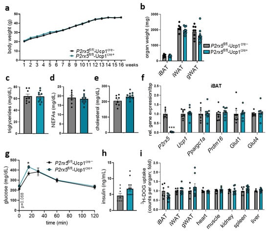 In obesity, insulin-resistant adipose tissue is associated with defective systemic glucose handling. To investigate glucose metabolism under obesogenic conditions, we challenged P2rx5fl/fl-Ucp1Cre+ mice and littermate controls by feeding a high-fat diet (HFD) to induce diet-induced obesity. After 16 weeks of HFD feeding, P2rx5fl/fl-Ucp1Cre+ mice and controls had similar body weights and organ weights, as well as plasma triglyceride and non-esterified fatty acid levels (Figure 6a–d). Plasma cholesterol levels were slightly elevated in mice lacking P2rx5 in brown adipocytes (Figure 6e). Moreover, gene expression of thermogenic markers in BAT was unaffected in P2rx5fl/fl-Ucp1Cre+ mice compared to P2rx5fl/fl-Ucp1Cre− mice (Figure 6f). In line with impaired blood glucose tolerance in conditions of regular diet feeding, obese mice with brown adipocyte-specific P2rx5 deficiency had higher blood glucose levels at basal and 15 min after oral glucose gavage (Figure 6g), as well as elevated plasma insulin levels (Figure 6h). To quantify the organ-specific glucose uptake, we traced the glucose gavage solution with radiolabeled 3H-deoxyglucose. Remarkably, elevated systemic glucose levels can be explained by reduced 3H-deoxyglucose disposal by the BAT of mice lacking P2rx5 in brown adipocytes (Figure 6i). Taken together, these data indicate that in brown adipocytes P2rx5 shapes systemic glucose handling in both basal and obese conditions.