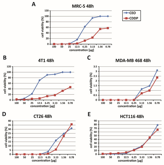 Dose-dependent cytotoxic effects of CEO. This figure illustrates the dose-dependent cytotoxicity of the CEO on various cell lines, as assessed by the MTT assay, following 48 h of exposure. The graphs show the survival rates of human fibroblasts (MRC-5) (A), murine and human breast carcinoma cells (4T1 and MDA-MB 468) (B,C), and murine and human colon cancer cells (CT26 and HCT116) (D,E), treated with the CEO and cisplatin (CDDP). The data presented represent mean values from three independent experiments, each conducted in triplicate.