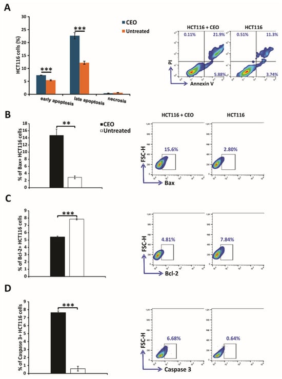 The evaluation of apoptosis in HCT116 cells treated with CEO was performed using the Annexin V and propidium iodide double-staining assay. In this analysis, cells were treated with the CEO and then stained with Annexin V-FITC and PI. The results, shown in Figure 2A, demonstrated that a significant portion of HCT116 cells underwent both early and late apoptosis after 24 h of treatment with the CEO. Notably, necrosis does not appear to be the mechanism of cell death through which the CEO exerts its effects, as HCT116 cells did not undergo necrosis (Figure 2A). These findings highlight the dual mechanism of the CEO, which promotes cell death via apoptotic pathways, by suggesting its potential as a powerful anti-carcinoma agent. The results of this study indicate that treatment with IC50 concentrations of the CEO significantly increased the percentage of Bax+ HCT116 cells, while simultaneously reducing the percentage of Bcl-2+ HCT116 cells (Figure 2B,C). Furthermore, the CEO was shown to enhance the percentage of caspase-3+ HCT116 cells (Figure 2D). The observed increase in caspase-3 expression, coupled with a decrease in Bcl-2 expression, points to potential mechanisms of action for the CEO, particularly in inducing apoptosis. Additionally, the marked increase in Bax, a pro-apoptotic protein, following treatment with the CEO, underscores the role of CEO in promoting apoptosis in HCT116 cells.