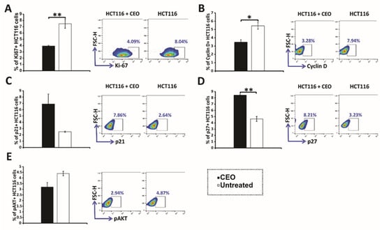 Expression of cell-cycle and signaling proteins in HCT116 cells treated with CEO. The expression of Ki67 (A), Cyclin D (B), p21 (C), p27 (D), and p-AKT (E) in HCT116 cells treated with the CEO is displayed. Representative FACS plots show the expression of key proteins following 24 h of exposure to the CEO. The data, obtained from flow cytometry, are presented as the mean ± SEM from three independent experiments. Statistical analysis was performed using the non-parametric Mann–Whitney test. Statistical significance is indicated by * p < 0.05 and ** p < 0.01, highlighting significant differences in protein expression between CEO-treated cells and the untreated control group.