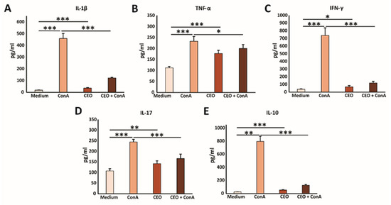 CEO decreases cytokine production in vitro. The graphs display the concentrations of IL-1β (A), TNF-α (B), IFN-γ (C), IL-17 (D), and IL-10 (E) in the supernatants of splenocytes from healthy mice after 24 h of incubation with medium only, ConA, CEO, or a combination of CEO and ConA. The data are presented as the mean ± SEM. Statistical analysis was performed using the non-parametric Kruskal–Wallis test. Statistical significance is indicated by * p < 0.05, ** p < 0.01, and *** p < 0.001, highlighting significant differences in cytokine concentration between groups.