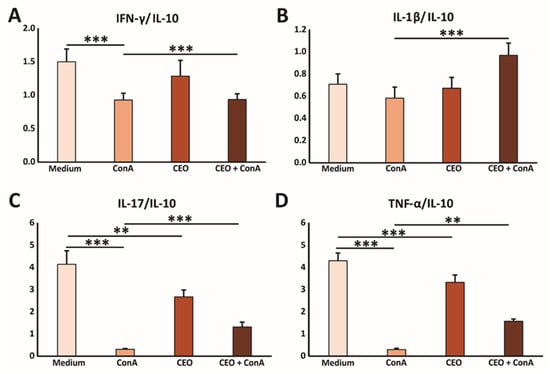 CEO facilitates the predominance of the pro-inflammatory cytokine milieu in vitro. The graphs display the ratios of IFN-γ/IL-10 (A), IL-1β/IL-10 (B), IL-17/IL-10 (C), and TNF-α/IL-10 (D) measured in the supernatants of splenocytes from healthy mice after 24 h of incubation with medium only, ConA, CEO, or a combination of CEO and ConA. The data are presented as mean ± SEM. Statistical analysis was performed using the non-parametric Kruskal–Wallis test. Statistical significance is indicated by ** p < 0.01, and *** p < 0.001, highlighting significant differences in cytokine concentration between groups.