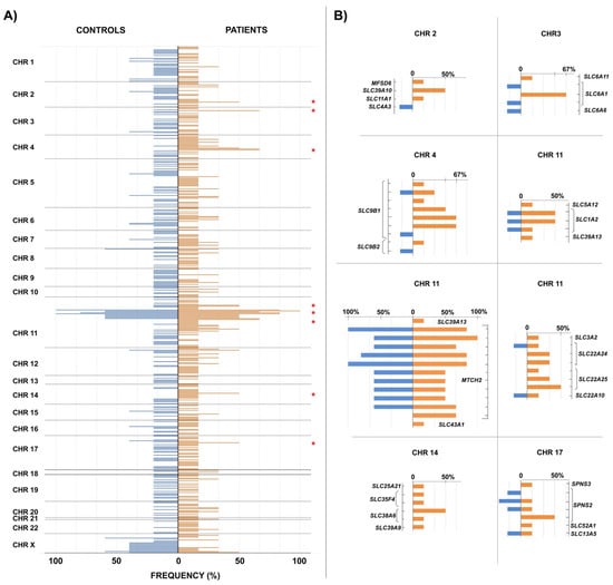 SLC gene superfamily variant distribution among patients and controls. In panel (A) Figure 1 shows the frequencies (in percentages) of the total number of SLC gene superfamily variants observed in the control group (in blue) towards the left of the vertical axis, while those of the patients are drawn to the right of the axis (in orange). When the same variant appears in both control individuals and patients, the bases of the corresponding bars coincide on the position of the vertical axis. Panel (B) shows in detail the regions marked with a red asterisk in panel (A). The positions of the variants on the vertical axis are ordered relative to each other but are not scaled.