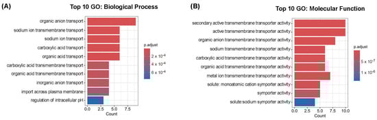 Gene Ontology enrichment analysis of SLC candidate genes. Top 10 enriched GO terms in the Biological Process (BP) category (A) and in the Molecular Function (MF) category (B). The input consisted of 13 human solute carrier (SLC) genes from Table 2 and Table 9. Bar plots display the most significant GO terms ranked by adjusted p-value.
