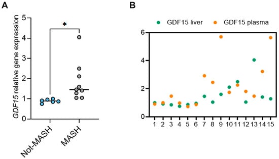 Since it has been shown that, under experimental pathological conditions such as obesity, the liver, particularly the hepatocytes, contributes more than other organs to increasing the plasma levels of GDF15 [], we further evaluated whether the changes in GDF15 plasma levels reflected its altered expression at the hepatic level in our patients. For this purpose, liver sections from a subset of 15 patients with MASLD were used for the analysis of GDF15 gene expression levels, which resulted to be higher in MASH (n = 9) than in Not-MASH (n = 6) livers (Figure 3A). In addition, as shown in Figure 3B, we found a significant positive correlation between the changes in the plasma and hepatic GDF15 levels (Spearman’s r = 0.61; p = 0.016).
