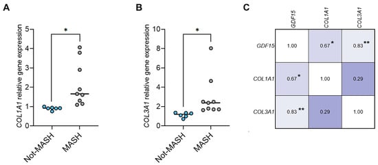 Hepatic gene expression levels of COL1A1 and COL3A1 and correlation with GDF15 gene expression in a subgroup of children with MASLD. The graphs show the relative hepatic gene expression of (A) COL1A1 and (B) COL3A1 in 9 children with a MASH diagnosis (MASH) and 6 children without MASH (Not-MASH) analyzed by qRT-PCR and normalized to the levels of the β-actin transcript. Unpaired t-test with Welch’s correction, * p < 0.05. (C) Heatmap of the correlations between GDF15, COL1A1, and COL3A1 fold inductions in a subgroup of children with MASH (n = 9), * p < 0.05; ** p < 0.01.