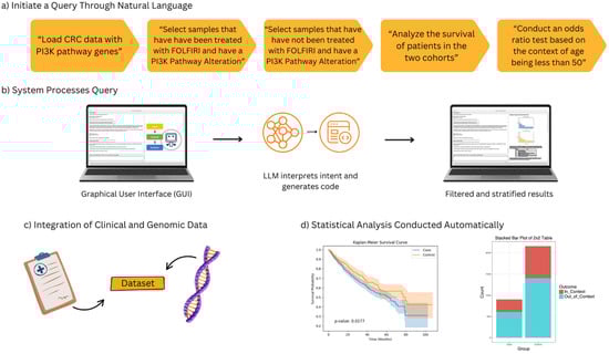 Conventional platforms, such as cBioPortal [] and UCSC Xena [], offer robust data access but fall short in three key areas: (1) real-time hypothesis testing, (2) user-friendly interface for non-programmers, and (3) contextualized analysis that incorporates variables such as ethnicity [,], MSI status [,,], and treatment history [,,,,]. These limitations hinder precision medicine efforts aimed at addressing molecular drivers of disease in underserved populations. Recent breakthroughs in artificial intelligence (AI)—specifically natural language-driven large language models (LLMs)—offer a new paradigm for clinical–genomic integration [,,,,,,,,]. These models are capable of interpreting user queries and converting them into executable analytical pipelines, democratizing data access and enabling hypothesis generation without the need for coding expertise. To harness this potential for cancer research, we developed AI-HOPE-PI3K—a conversational AI system designed to investigate PI3K pathway alterations in CRC using harmonized clinical and genomic data. Unlike generic analytic platforms, AI-HOPE-PI3K was engineered to perform pathway-centered analyses in response to natural language prompts, stratify patient cohorts by age, ancestry, and molecular profiles, and automate survival and association testing across large datasets.