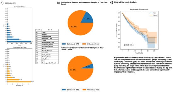AI-HOPE-PI3K analysis of PI3K-altered colorectal cancer (CRC) samples by primary tumor location (colon vs. rectum). This figure illustrates the application of AI-HOPE-PI3K to evaluate survival outcomes among CRC patients with PI3K pathway alterations, stratified by primary tumor site. (a) Bar plots display the distribution of tumor site annotations across the dataset, with “Colon” (X0) and “Rectum” (X1) representing the most frequent anatomical sites. Colon samples constitute the majority of annotated entries (45.4%), while rectal tumors account for 22.7%. All other primary sites are shown for context. (b) Pie charts visualize the subset of samples selected through natural language-driven query filters. The case cohort includes 977 CRC patients with PI3K-altered tumors located in the colon (17.6% of the dataset), while the control cohort consists of 343 patients with PI3K-altered tumors in the rectum (6.2% of the dataset). (c) Kaplan–Meier survival curves compare overall survival between the two groups. CRC patients with PI3K pathway alterations originating in the colon exhibited significantly worse survival outcomes compared to those with rectal tumors (p = 0.0177). Shaded regions represent 95% confidence intervals.