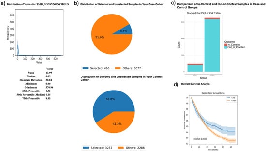 AI-HOPE-PI3K analysis of tumor mutational burden (TMB) and survival outcomes in colorectal cancer (CRC) patients treated with FOLFIRI chemotherapy, stratified by MTOR mutation status. This figure demonstrates the use of AI-HOPE-PI3K to evaluate survival and mutation context in CRC patients treated with the FOLFIRI regimen (Fluorouracil, Leucovorin, Irinotecan), stratified by TMB and analyzed for MTOR mutation enrichment. (a) A histogram displays the distribution of nonsynonymous TMB across all samples. The mean TMB is 13.99, with a median of 6.05 and a long right-tailed distribution. These metrics contextualize the threshold (TMB > 10) used to define the high-TMB case cohort. (b) Pie charts show the distribution of selected samples within each cohort following query-based stratification. The case cohort includes 466 high-TMB CRC patients treated with FOLFIRI (8.4% of the dataset), while the control cohort includes 3257 low-TMB CRC patients treated with the same regimen (58.8% of the dataset). (c) A 2 × 2 odds ratio analysis evaluates the enrichment of MTOR mutations between the two groups. The stacked bar plot shows that MTOR mutations were more frequently observed in the high-TMB group. However, detailed statistical outputs are not shown here. (d) Kaplan–Meier survival curves compare overall survival between high-TMB and low-TMB patients, both treated with FOLFIRI. Patients with high TMB exhibited significantly improved survival outcomes (p = 0.0032). Shaded areas represent 95% confidence intervals, indicating a robust survival benefit associated with elevated TMB in the context of FOLFIRI chemotherapy.