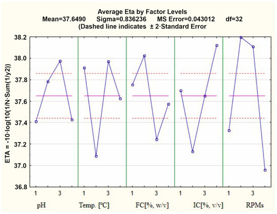 Indices 1, 2, 3, and 4 represent the levels of the factors, with the symbol L denoting level. The objective of the optimization was to determine the input factor levels that would maximize the degradation of chicken feathers. The system’s response was characterized by a degree of feather degradation. In order to reduce systematic errors, each configuration was subjected to three experimental repetitions. The parameters with the highest desired value were selected, and the signal-to-noise (S/N) ratio, indicating controllable factors in relation to confounding factors, was calculated using the following formula: