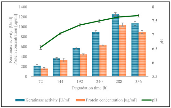The activity of keratinolytic enzymes, protein concentration, and pH changes in the culture medium were assessed during the culture period (Figure 2). The enzyme activity constantly increased throughout the culture, to a peak of 1257.50 ± 30.64 U/mL on the 288th day of the process. A subsequent decline in the value to 1068.33 ± 38.04 U/mL was noted. The maximum protein concentration, derived from extracellular proteins secreted by strain S7 and from feather decomposition, reached 945.76 ± 13.89 µg/mL on the 366th day of culture. The pH of the medium increased from 7.00 ± 0.06 at the beginning of the culture process to 7.69 ± 0.05 after 336 h of culture.