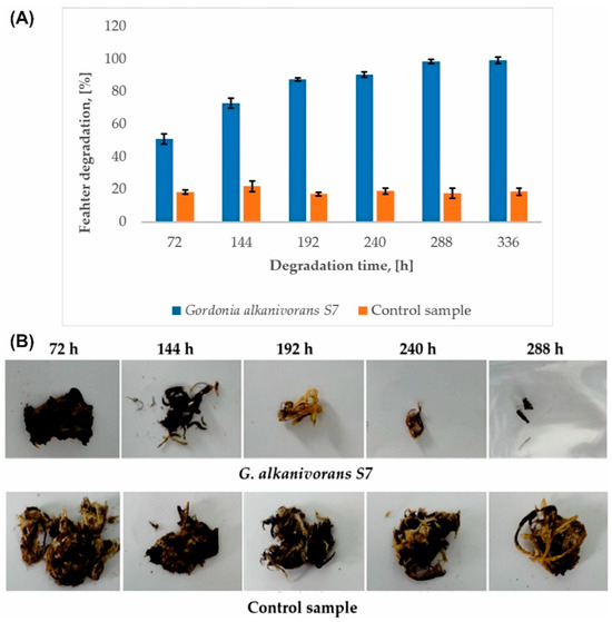 (A) Efficiency of chicken feather degradation by G. alkanivorans S7 (p-value was 0.05). (B) Macroscopic view of residues of chicken feathers during biodegradation by G. alkanivorans S7.