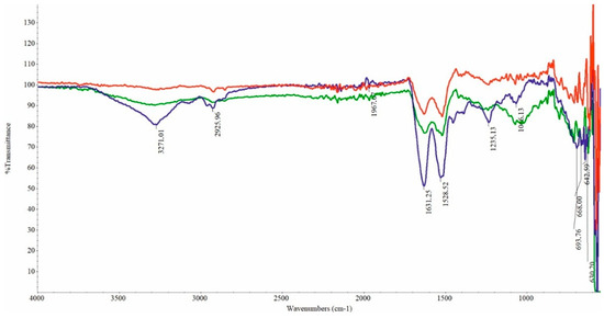 FTIR spectra of chicken feathers before and during biodegradation: blue—“0” sample; red—control sample after 288 h; green—biodegradation sample after 288 h.