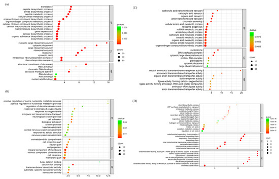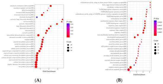The entries in the GO annotations, other than the first three major categories, were analyzed for enrichment. The results of the analysis were made into GO enrichment bubble plots by fold enrichment from high to low and top to bottom, with p < 0.05 (Figure 4).