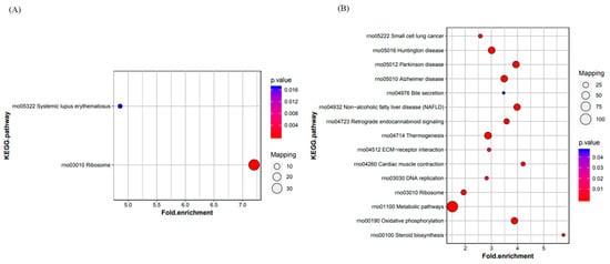 KEGG pathway enrichment analysis showed that 23 pathways were involved in differential protein expression in the Model/Cell group, of which the only two pathways with a p value of Fisher’s exact test of less than 0.05 were the ribosomal pathway and the SLE pathway (Figure 5A). A total of 65 pathways were involved in the Drug/Model group, of which 15 pathways with a p < 0.05 were steroid biosynthesis, myocardial contraction, non-alcoholic fatty liver disease, Parkinson’s disease, oxidative phosphorylation, ECM–receptor interaction pathways, and so on. Fifteen pathways had p < 0.05, including steroid biosynthesis, myocardial contraction, nonalcoholic fatty liver disease, Parkinson’s disease, oxidative phosphorylation, and ECM–receptor interaction pathways (Figure 5B). In addition, the pathways of myocardial contraction, nonalcoholic fatty liver disease, Parkinson’s disease, Alzheimer’s disease, Huntington’s disease, and thermogenesis have common protein involvement with the oxidative phosphorylation pathway.