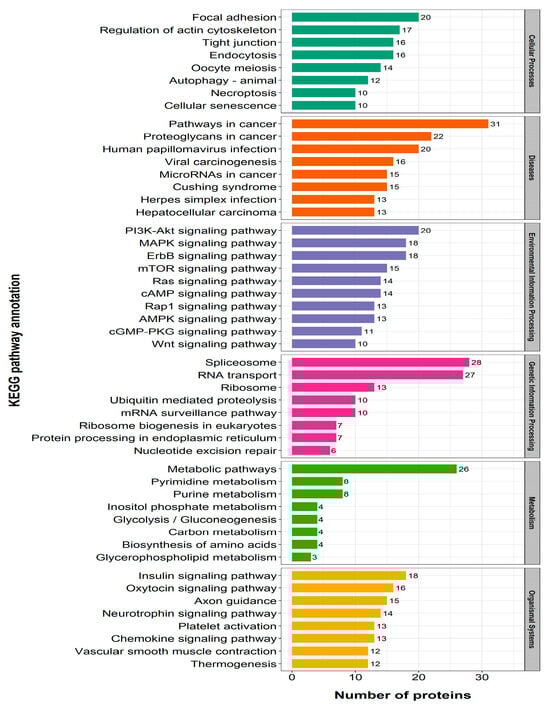 Bioinformatics tools were employed to conduct further analyses on proteins exhibiting significant differential abundances as observed in the proteomic analysis. A Gene Ontology (GO) annotation proteome was obtained from the Geneontology database (http://www.geneontology.org/; accessed on 26 March 2025). To perform family and pathway studies of functional proteins on the identified proteins, GO and KEGG were utilized. Proteins were classified by GO annotation based on three categories: biological process, cellular component, and molecular function. For each category, the enrichment of DEPs against all identified proteins was tested using a two-tailed Fisher’s exact test. The Kyoto Encyclopedia of Genes and Genomes (KEGG) database was used to identify enriched pathways by a two-tailed Fisher’s exact test to test the enrichment of the DEPs against all identified proteins. The pathways with a corrected p value < 0.05 were deemed significant.